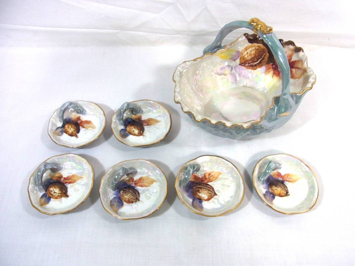 > アンティーク オールドノリタケ ハンドプリント 手描 バスケット手付+豆皿 クルミ柄 使用感少