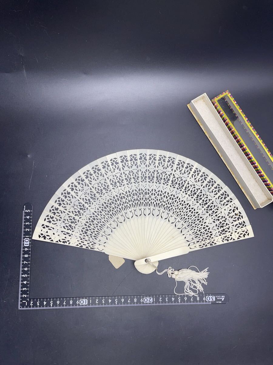 - A8k17 鯨歯風扇子 65g 細密彫刻 天然素材 中国美術 東洋彫刻