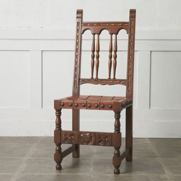 > IZ95083N★スペイン ヴィンテージ ダイニングチェア 本革 木彫刻 ビーチ 無垢材 椅子 木製 鋲打ち ハイバック サイドチェア クラシック
