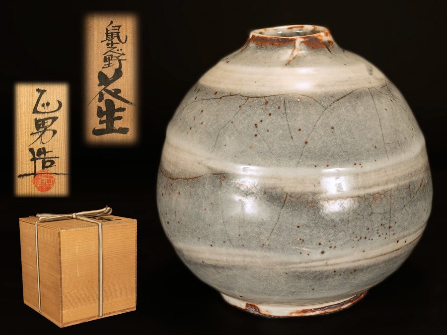 ●小栗正男 造 鼠志野花生 壺 花瓶 共箱●