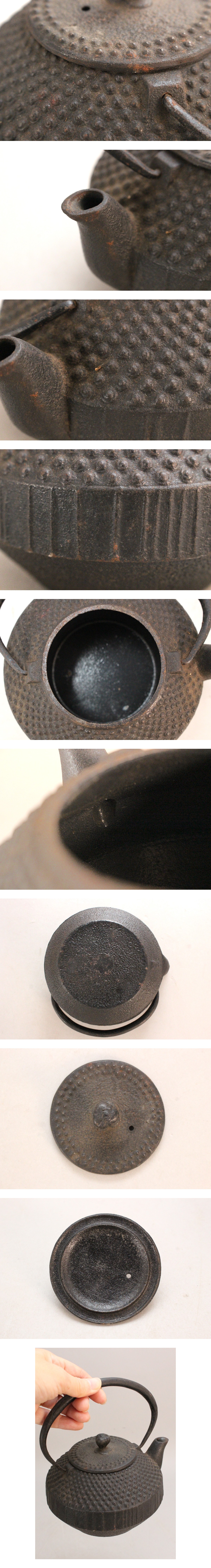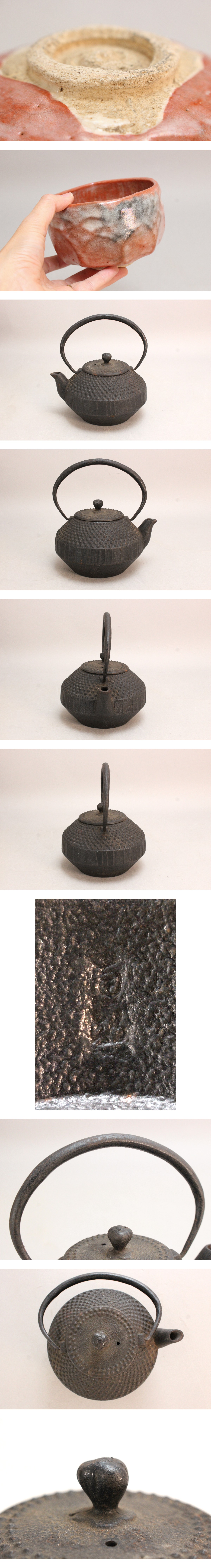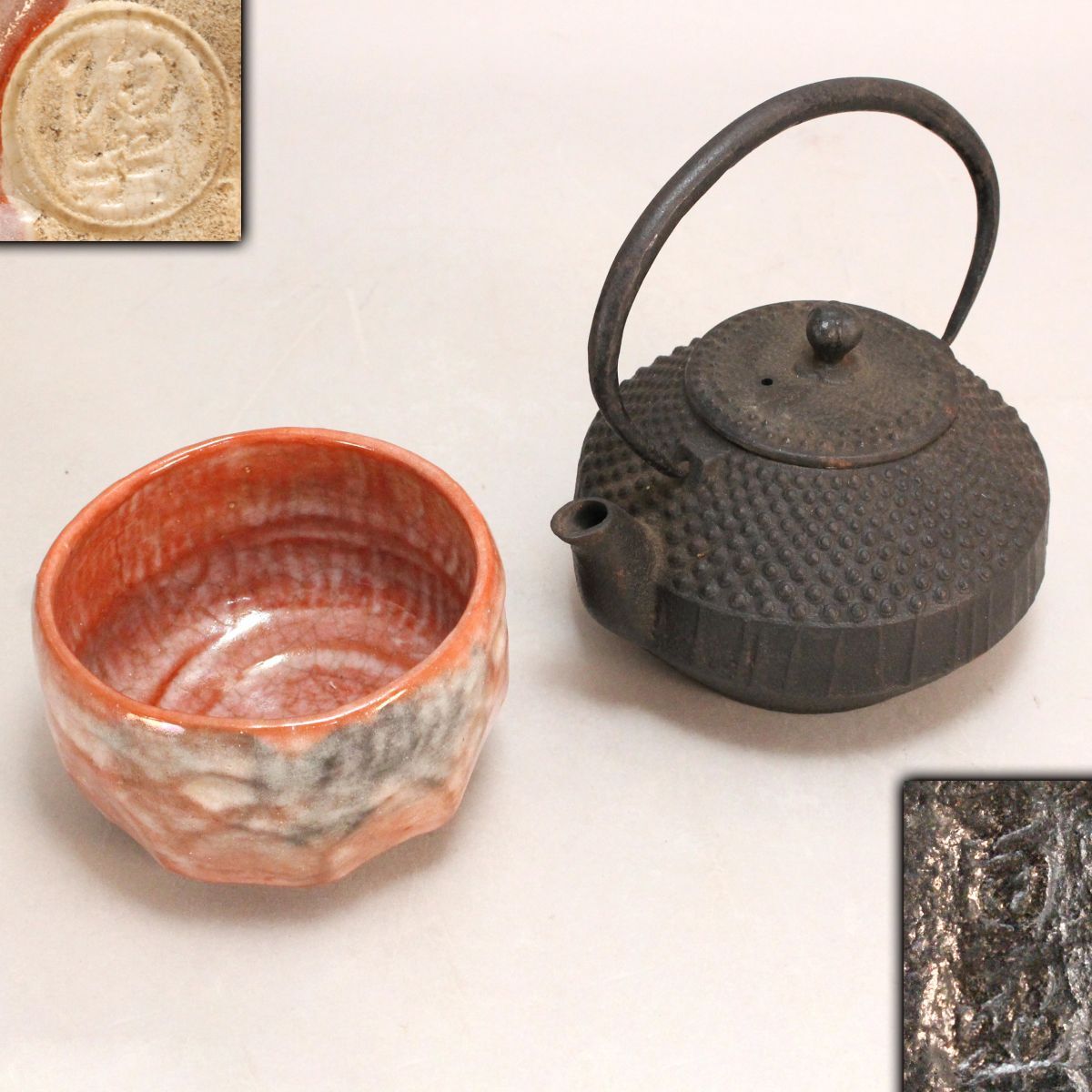 > [244180]高台寺窯 森里陶楽 赤楽茶碗 直径11.5cm 陶印有/南部 霰鉄瓶◆茶道具/茶器/陶磁器/鉄器/古美術/骨董/うぶ品