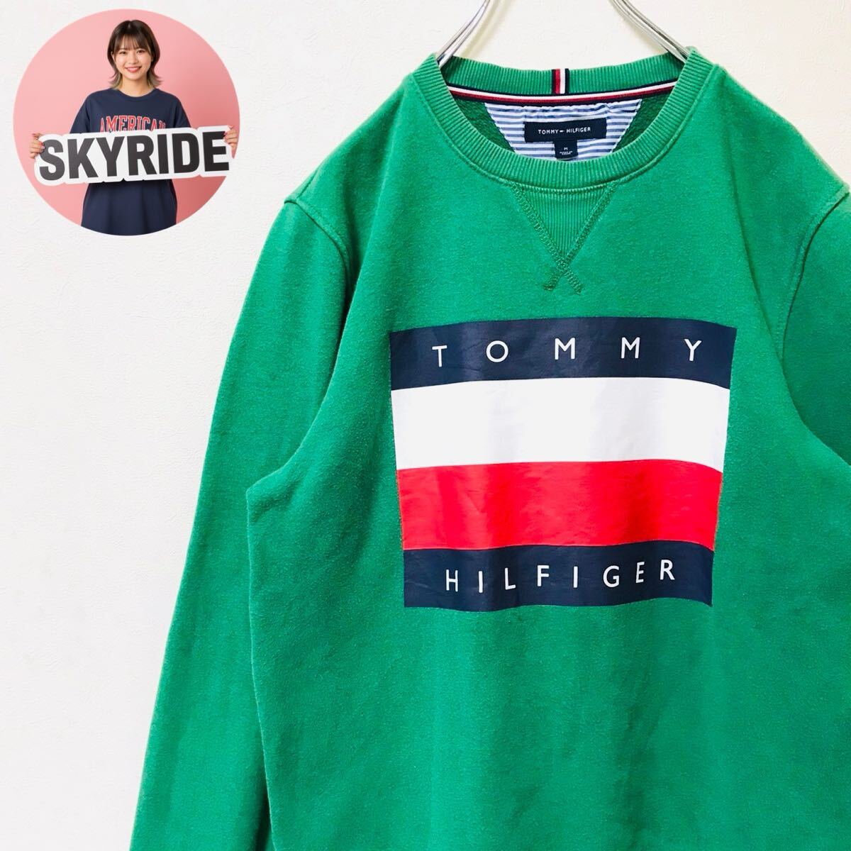 - 【人気】TOMMY HILFIGER トミーヒルフィガー スウェット グリーン M ビッグロゴ 刺繍 フラッグ ゆるだぼ 古着男子 トレーナー 古着 #TT0376