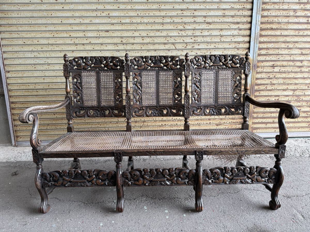 - 【YO-1330】ベンチ 3人掛け ラタン 籐 木彫り 昭和レトロ アンティーク