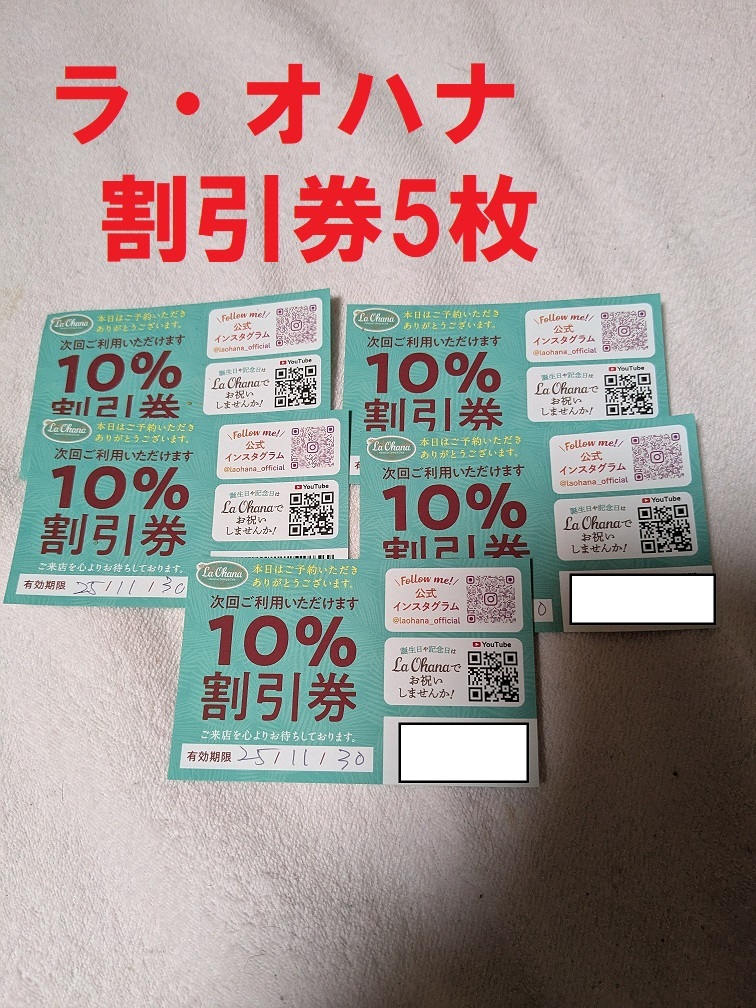 - ラ・オハナ 10%割引券 5枚 人気のハワイアンレストラン