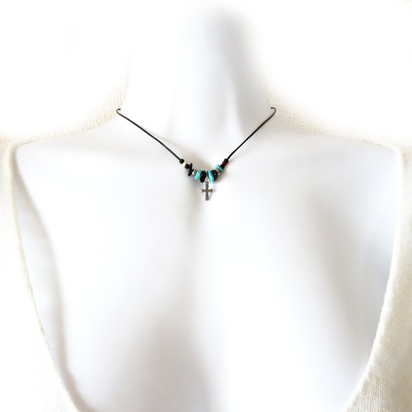 - 革紐細めネックレス チョーカー ミニクロスチャーム ステンレス金具 オニキス 染ターコイズ BN23