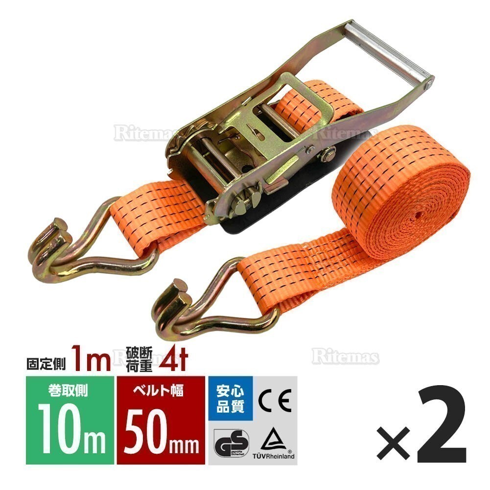 - ラッシングベルト フック トラック 幅 50mm ラチェットベルト ラチェット式 固定側1m 巻側10m 荷重4000kg タイダウンベルト 2本set 1年保証