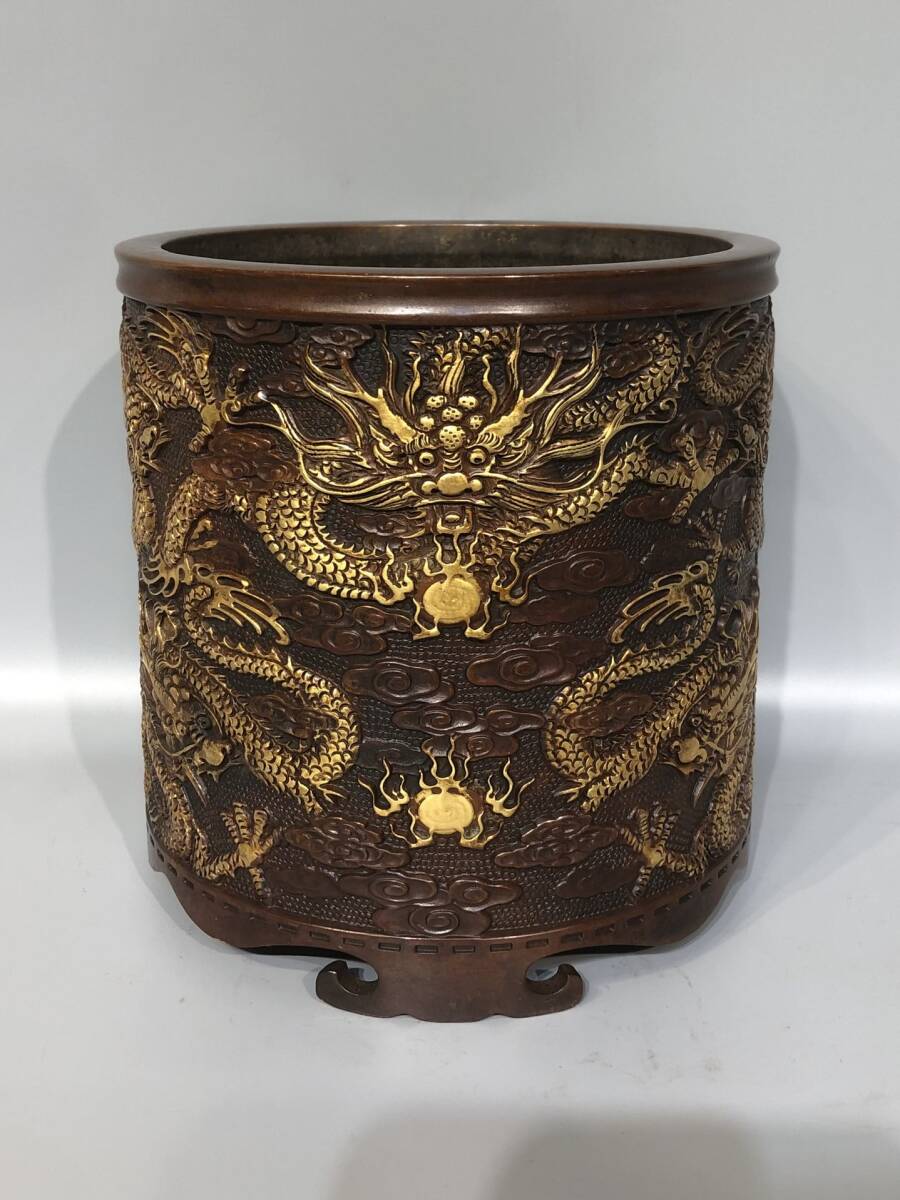 > ◆珍蔵◆中国古美術 大明宣徳年製款 古銅製 紫銅塗金 高浮雕 九龍戯珠筆筒 細密細工造 置物 擺件 古賞物 骨董品 時代物 A13