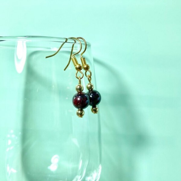 > ガーネット ピアス 一粒フックピアス 8mm (ゴールド) イヤリング、樹脂フック変更可 樹脂ピアス シンプル パワーストーン 天然石