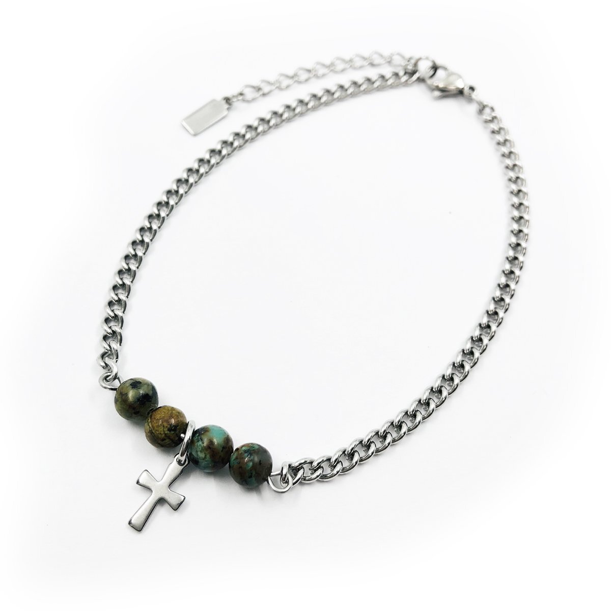 - パワーストーン ミニクロス ステンレスアンクレット アフリカンターコイズ 27cm(23+4cmアジャスター) 3.5mm幅喜平 FN205