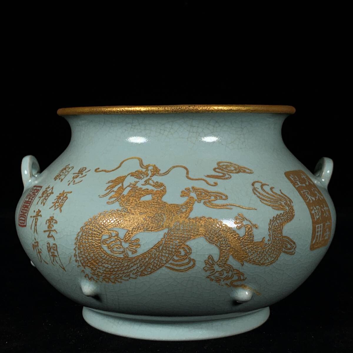 - 『館蔵珍品 宋 古陶瓷品 汝窯 包口 銘文龍紋 雙系罐 陶藝』稀少珍蔵品 古賞物 貴重物品 収蔵品 中国古美術 時代物 古董品