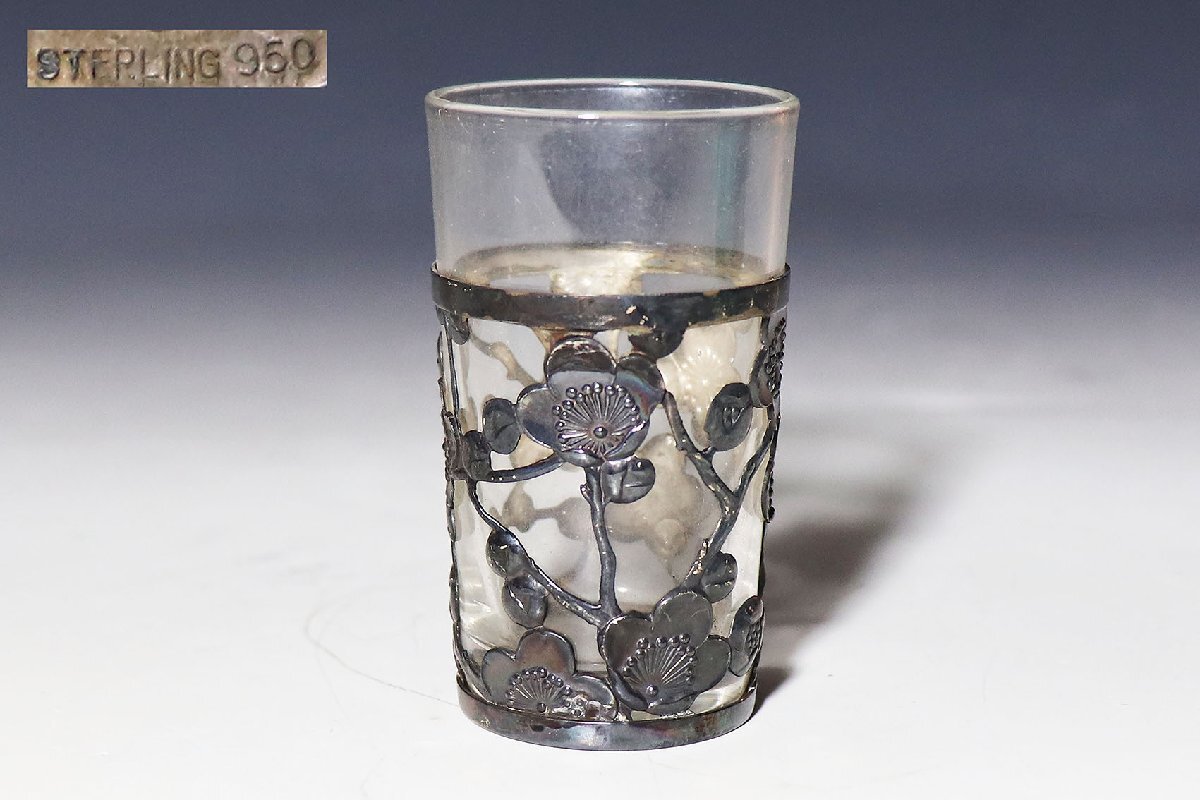 - 【桃】酒器ぐい呑み:銀製透かし彫梅花図ガラスショットグラス