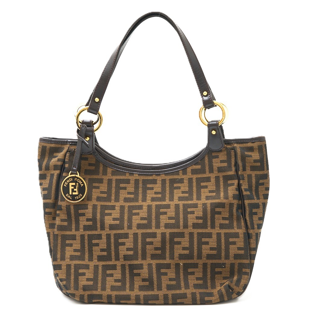 - FENDI フェンディ ズッカ ハンドバッグ 2WAY トート ショルダーBAG レザー カーキブラウン×ゴールド シンプル レディース