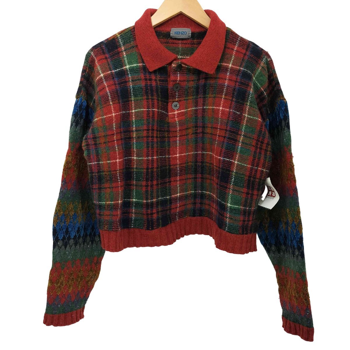 - KENZO(ケンゾー) 90S モール糸 タータン チェック 袖 ノルディック柄 切替 クロップド ポロ 中古 古着 0126