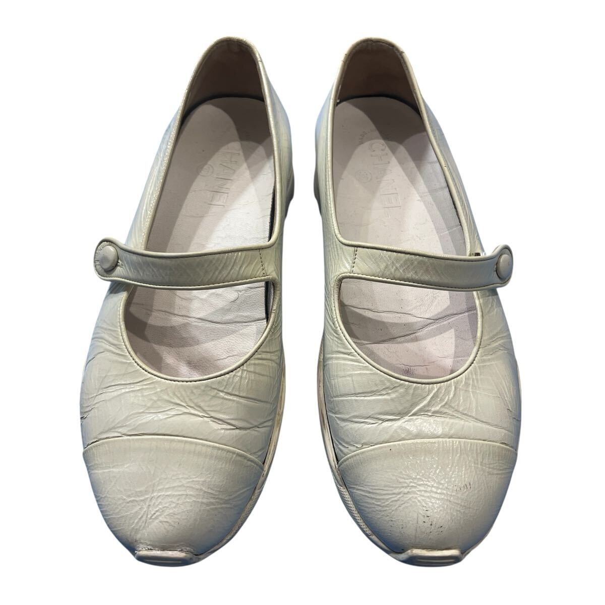 - シャネル ロゴチャーム レザー バレエシューズ ラバーソール 白CHANEL Logo Charm Leather Ballet Shoes / Rubber Sole White