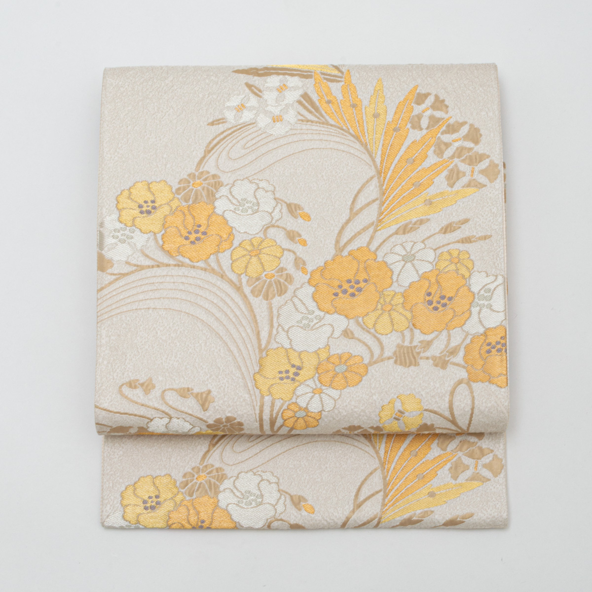 > 【TOKIO et TOKI】袋帯 曲線と花の図 オフホワイト 金糸 西陣織 正絹 礼装用 未使用品 未仕立て品 扇綾(おうぎりょう)謹製