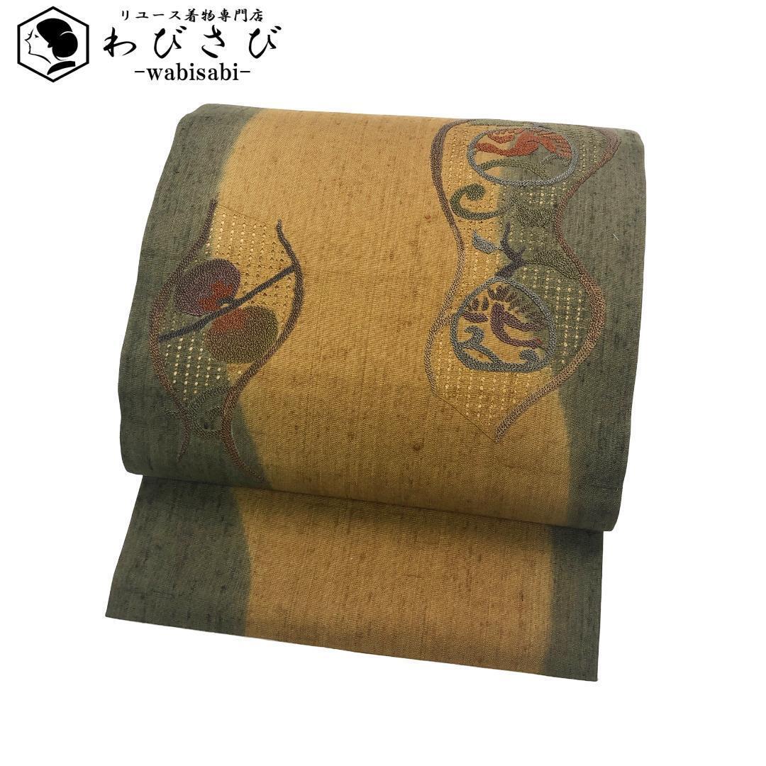 - 名古屋帯 紬 汕頭刺繍 相良刺繍 果実 鳥 黄橡色 O-5526 着物 きもの kimono 和服 和装 中古 リサイクル着物 【送料無料】