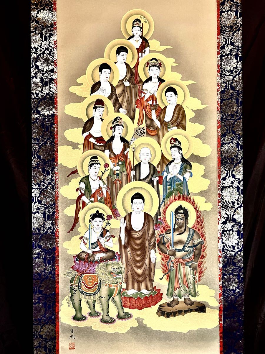 - 【真作】【S8】西山日照「十三佛」絹本 肉筆 共箱 金泥 大幅 仏画 仏教美術 釈迦如来 文殊菩薩 不動明王 鳥獣 絵画 掛軸 日本画家 岐阜の人
