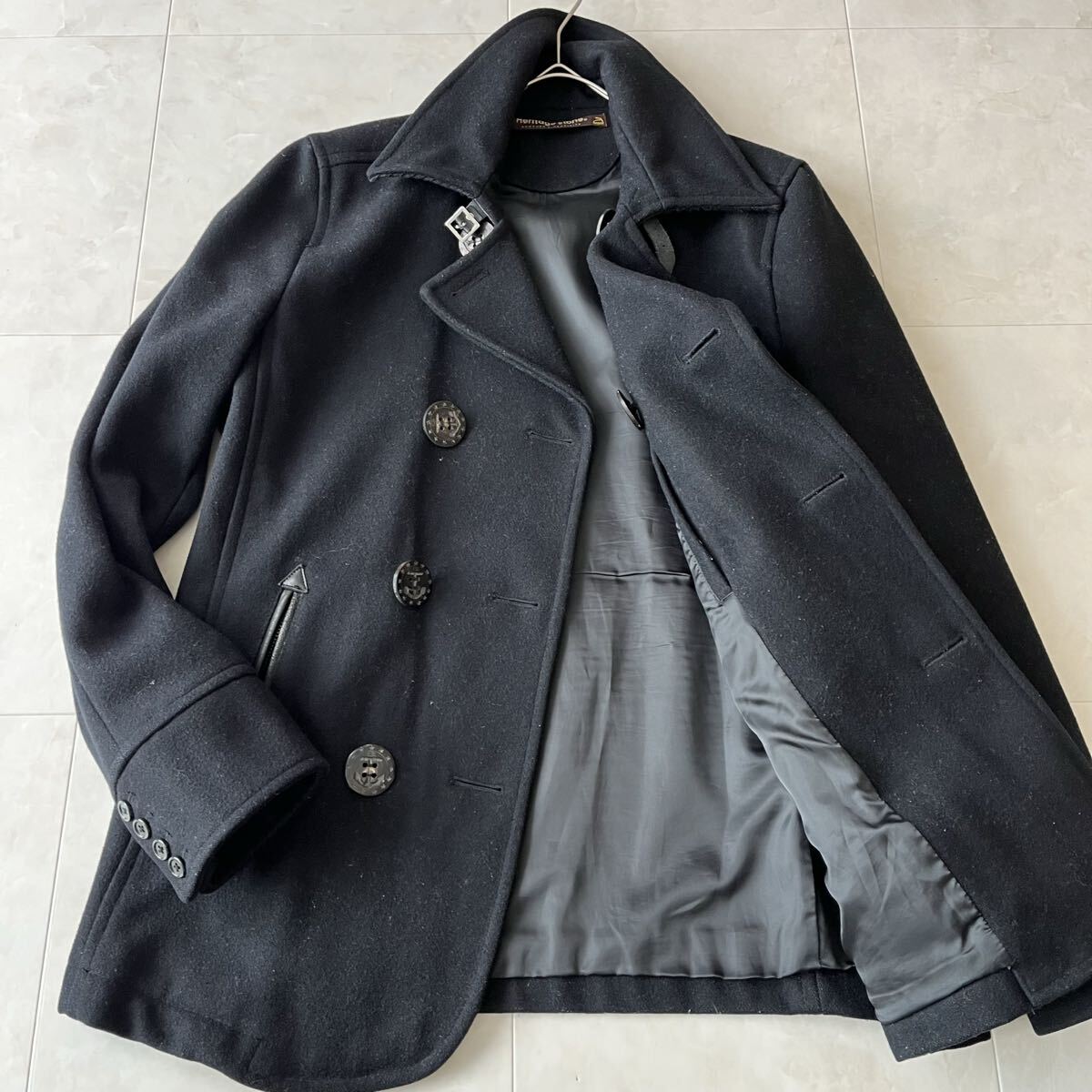 > 希少!Heritage Stone Pコート 黒 レザー切替 水牛ボタン仕様 L