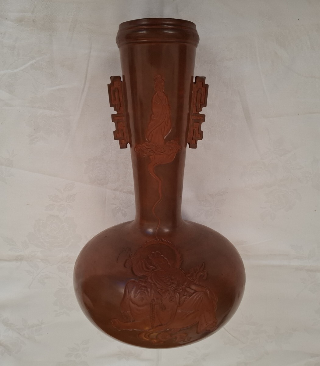 > 中国古玩 欽州窯 朱泥 花器 文殊菩薩 雷紋双耳 「中国欽州」 在印 宜興紫砂