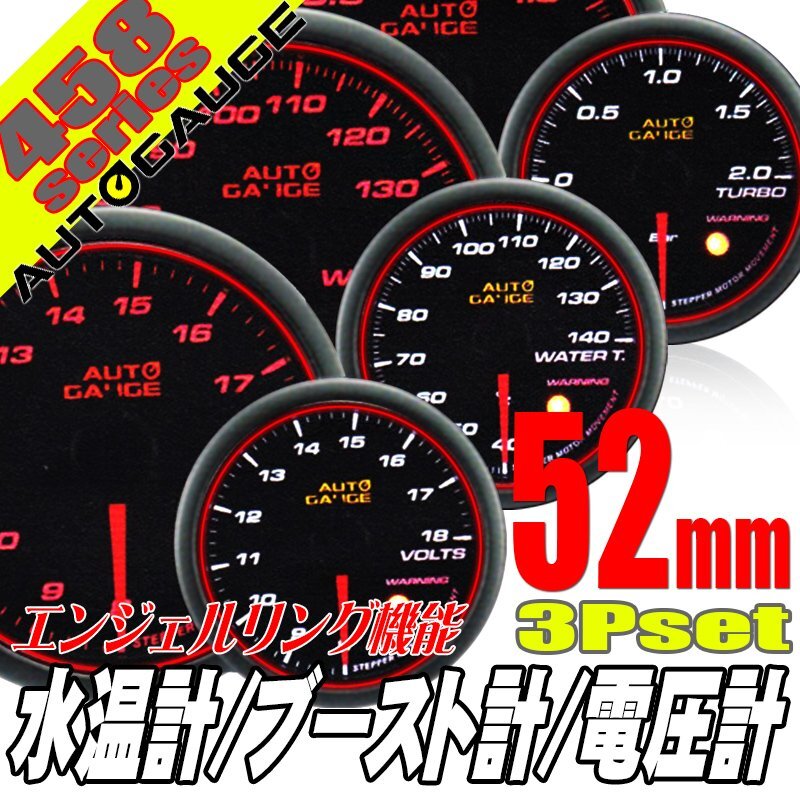 > オートゲージ ブースト計 電圧計 水温計 52Φ 3連メーター 458 3点セット 日本製モーター エンジェルリング ワーニング 52mm
