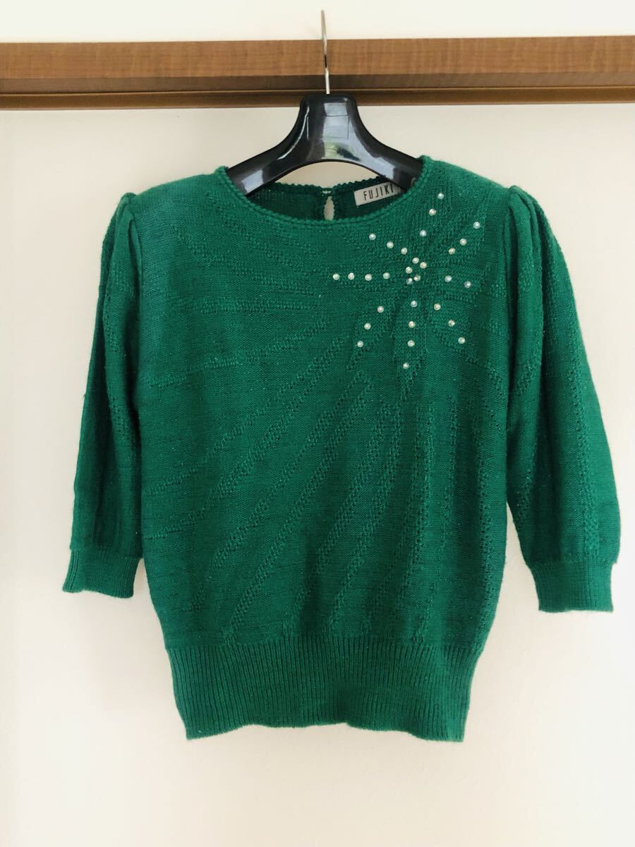 - FUJIKI グリーンニット パールビーズ装飾 七分袖トップス レトロ