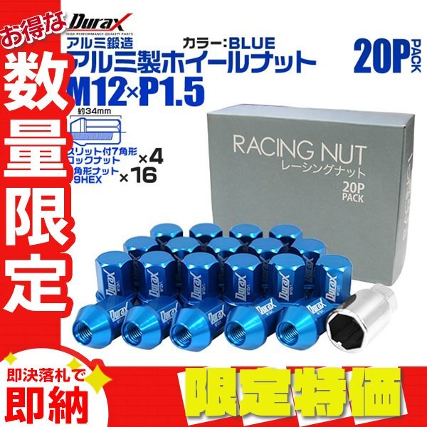 > 【限定セール】Durax正規品 レーシングナット 34mmロックナット M12 P1.5袋 青 20個 アルミ ホイールナット トヨタ 三菱 ホンダ マツダ