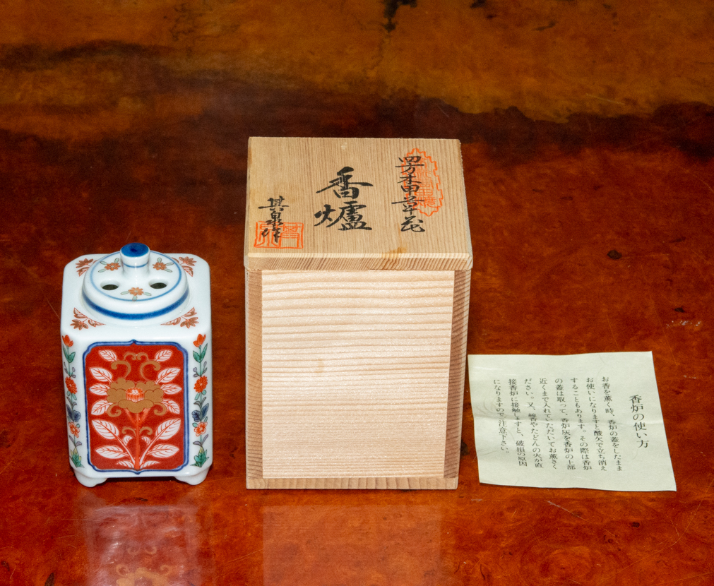 - 有田焼 其泉作 四方木甲草花 香炉 在銘 共箱 灰付きですぐ使えます 茶道具 香道具