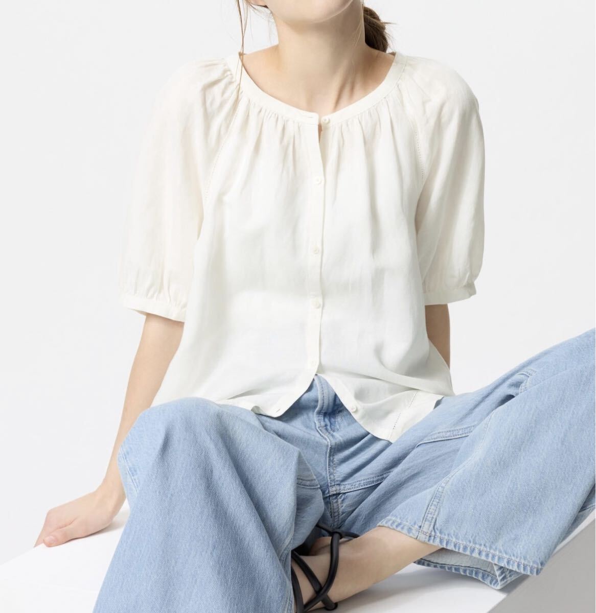 > 【中古】ユニクロUNIQLOリネンブレンドボリュームスリーブブラウスXLホワイト半袖