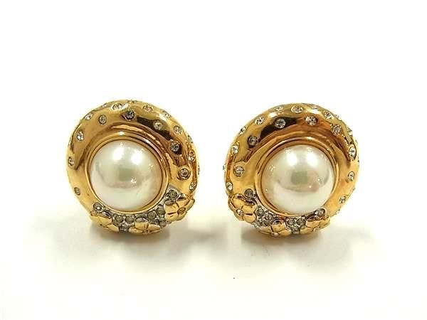 > ■美品■ NINA RICCI ニナリッチ ラインストーン パール クリップ式 イヤリング アクセサリー ゴールド系×アイボリー系 DI1419