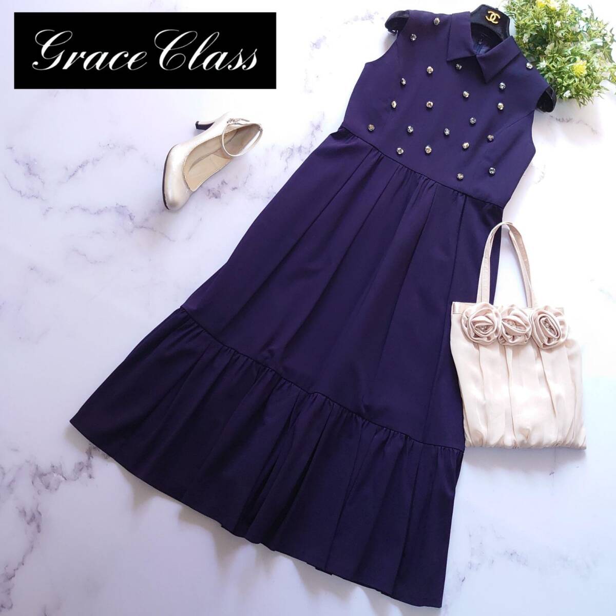 > 2020 GRACE CLASS グレースクラス ビジューティアードドレス ロングワンピース ネイビー 紺 フリル 襟 36 S グレースコンチネンタル