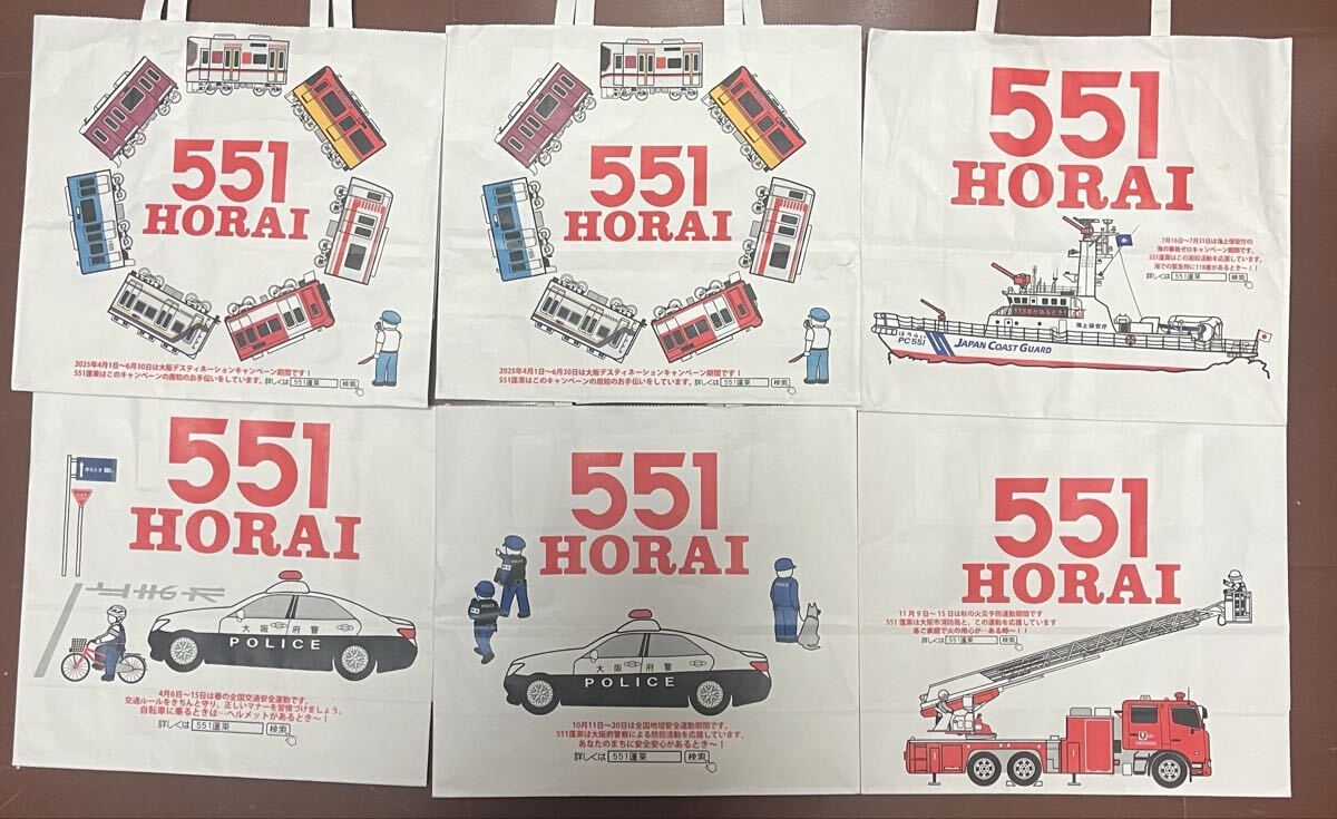 > ★551★蓬莱★限定紙袋★大阪府警2枚、大阪市消防局、海上保安庁、南海電車2枚★コラボ紙袋★限定品5枚セット★二つ折りにして発送