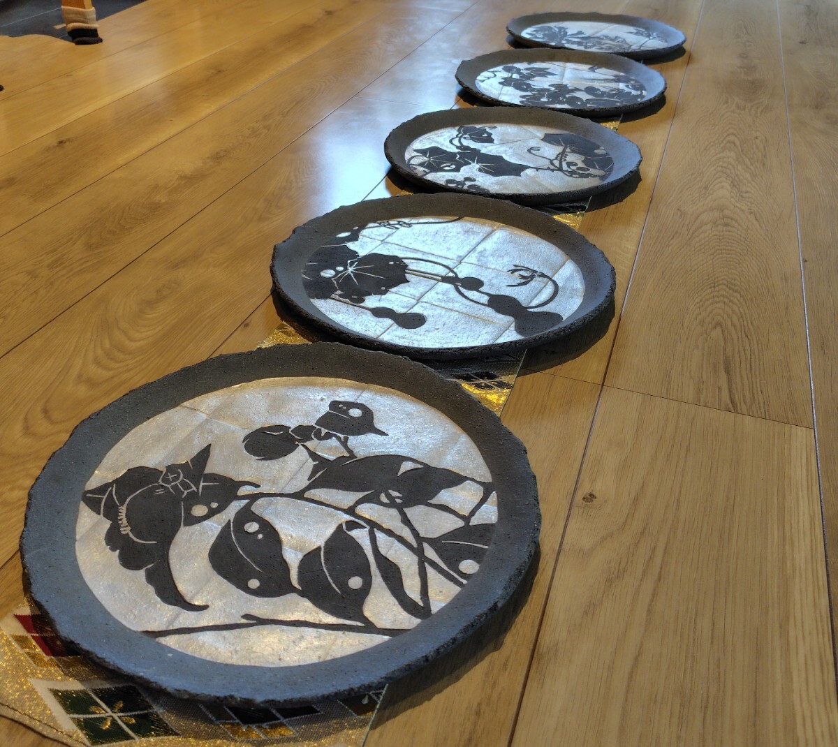 - 黒陶 染抜き皿5枚 直径31.5cm 美品 図変わり