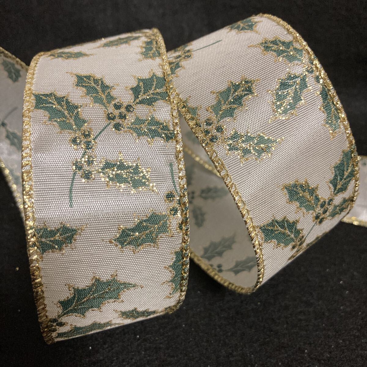 - リボン切り売り 1.5m 約3.8cm幅 クリスマスリボン 柊リボン ホワイト ヒイラギ