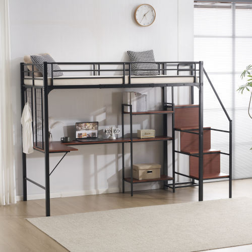 - ロフトベッド シングル 収納棚付き デスク付き 階段付き 北欧風 木目 子供ベッド 大人ベッド 一人暮らし スチール 耐震 ベッド ブ KU494