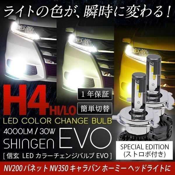 - ライトの色が瞬時に変わる! ストロボ 3色切替 LED 信玄 EVO 実測値28100cd H4 NV200 バネット NV350 キャラバン ホーミー ヘッド 1年保証
