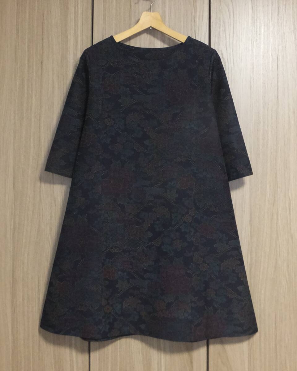 - ♪送料無料 ハンドメイド 着物リメイク 古布 正絹 特選手織紬 花柄 濃紺 シンプルAラインワンピース♪