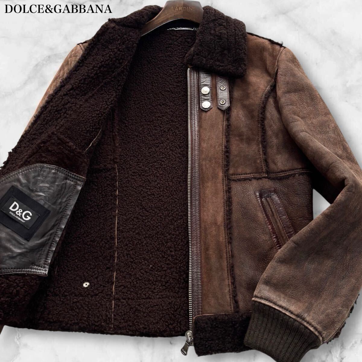 > 美品●DOLCE&GABBANA ドルチェ&ガッバーナ リアルムートン ライダース ジャケット ラムレザー 羊革 ボア襟 ロゴプレート ブラウン 46
