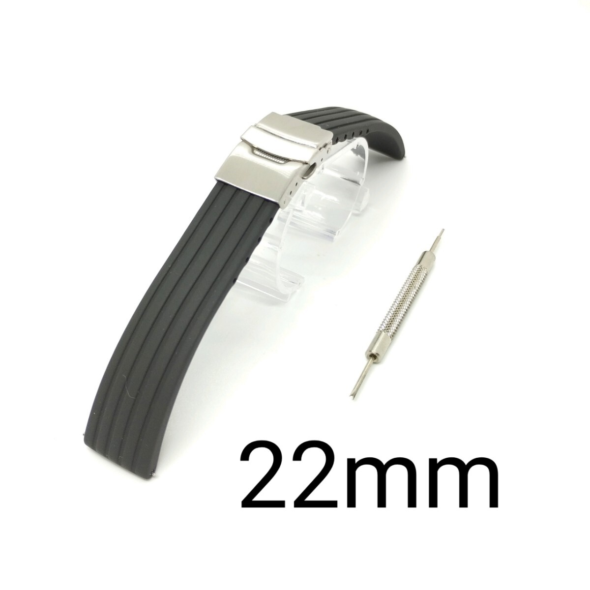 - 送料無料 22mm 腕時計 交換ベルト シリコン 黒 ブラック プッシュ式 バックル バネ棒外し付き B7