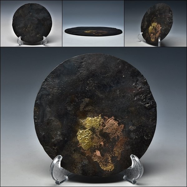 - SP6051 鍛鉄 鍛造 黒皮仕上 真鍮流し 4寸 丸皿 煎茶道具 盆 茶注敷 鉄皿 板皿 鍛冶 ロートアイアン