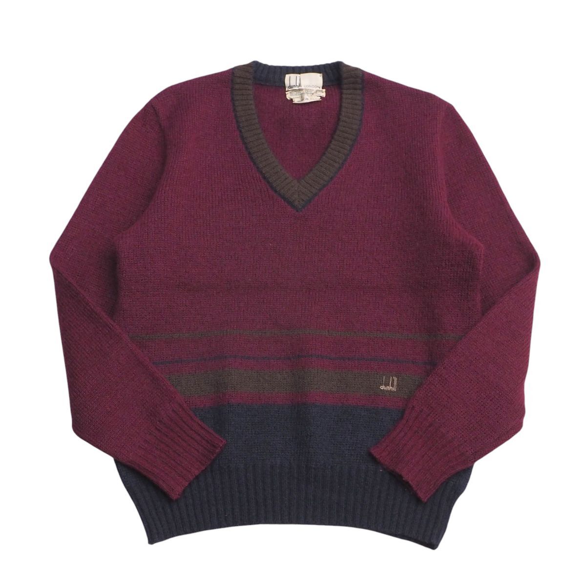 > MI1760+ヴィンテージ*イタリア製*dunhill/ダンヒル*メンズ48*モヘヤウール*ニットセーター*Vネック*ボーダー柄*バーガンディ系