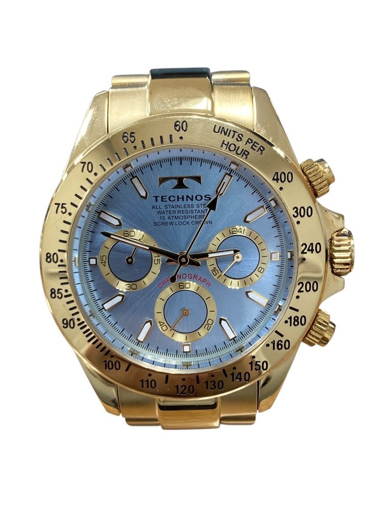 - キングラム[01]★稼働品★ TECHNOS テクノス クロノグラフ ブルー文字盤 メンズ 腕時計 T4B73 クォーツ ゴールド b4989
