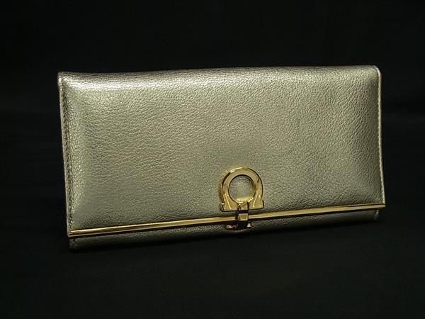 - 1円 ■美品■ Salvatore Ferragamo フェラガモ ガンチーニ レザー 二つ折り 長財布 ウォレット 小銭入れ 札入れ ゴールド系 GB2041