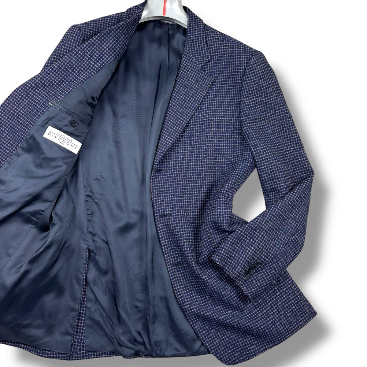 > 1円 美品 M~L ジバンシィ GIVENCHY テーラードジャケット ウール100% チェック柄 総柄 高級 イタリア製 メンズ ネイビー 48