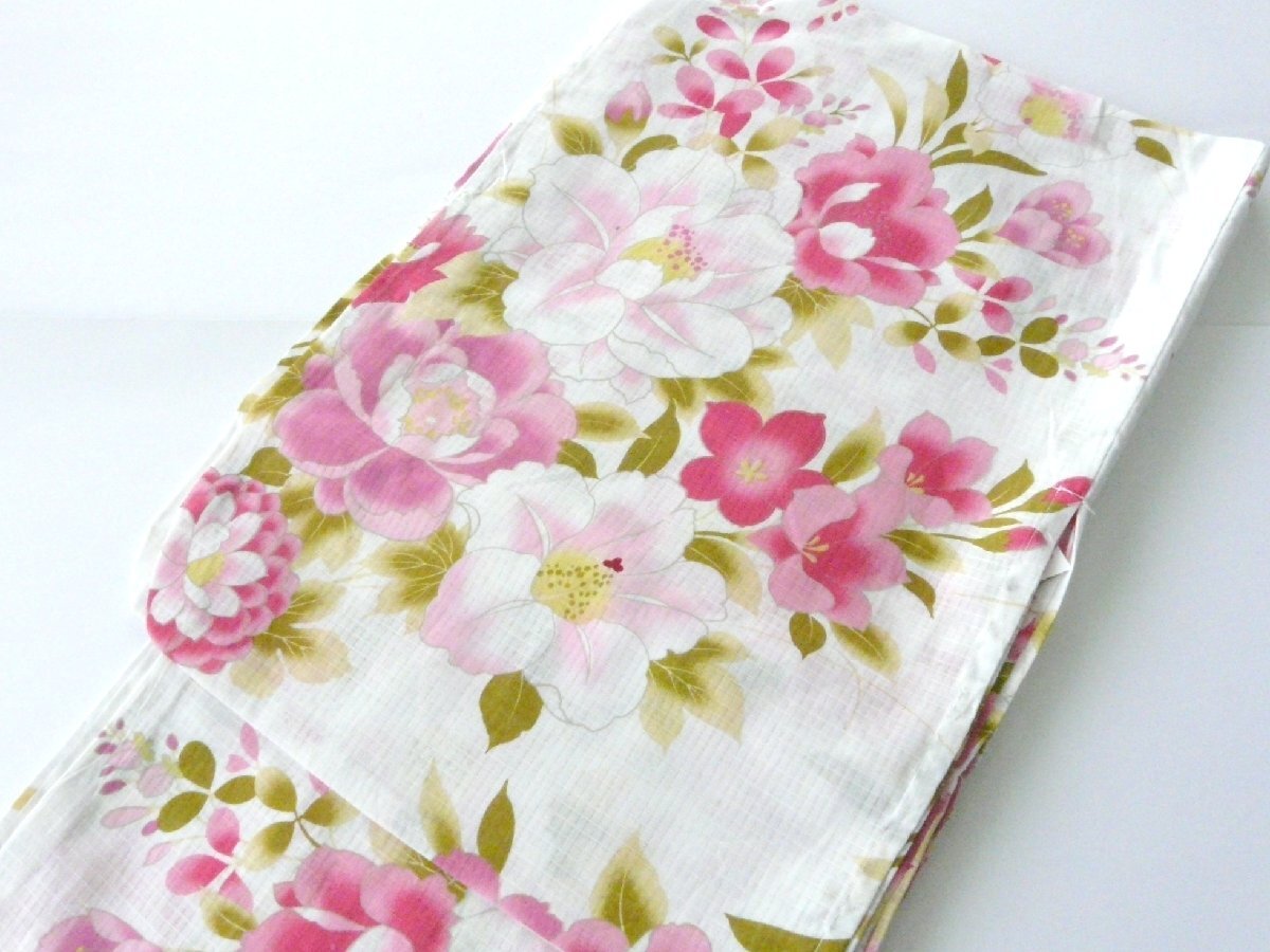 - 女性用ゆかた 浴衣 単品 仕立上り Fサイズ 綿 白地 薄ピンク 花柄 訳有 660 ggp