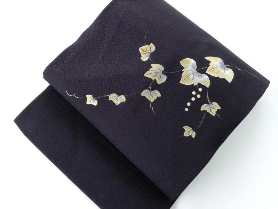 - 名古屋帯 正絹 八寸帯 [訳有] 紫色 金箔 ぶどう柄 仕立上り 173
