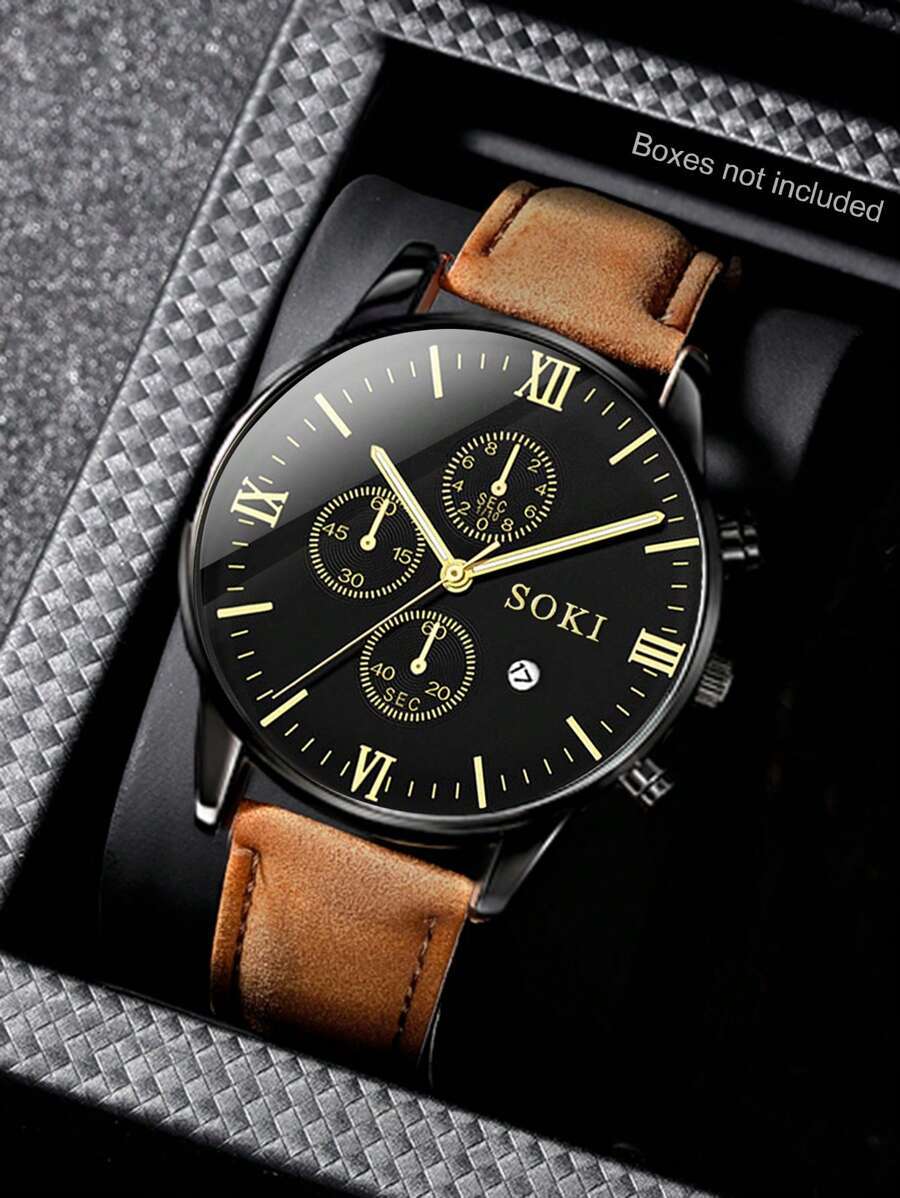 > 腕時計 メンズ クォーツ 1個 メンズ腕時計 カレンダー機能 スタイリッシュな丸型ダイヤル クォーツ PUストラップ 日常着用に最