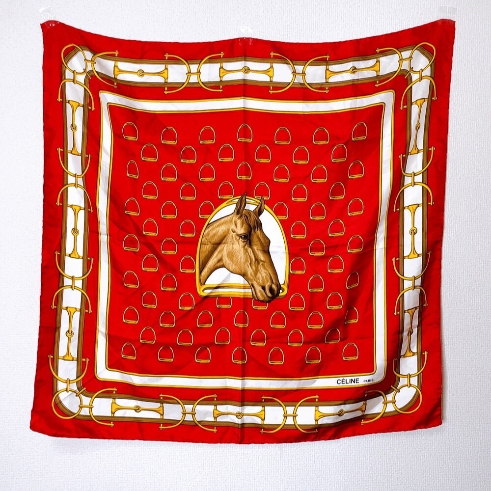 - CELINE スカーフ ストール 100%シルク 馬 馬具 レッド