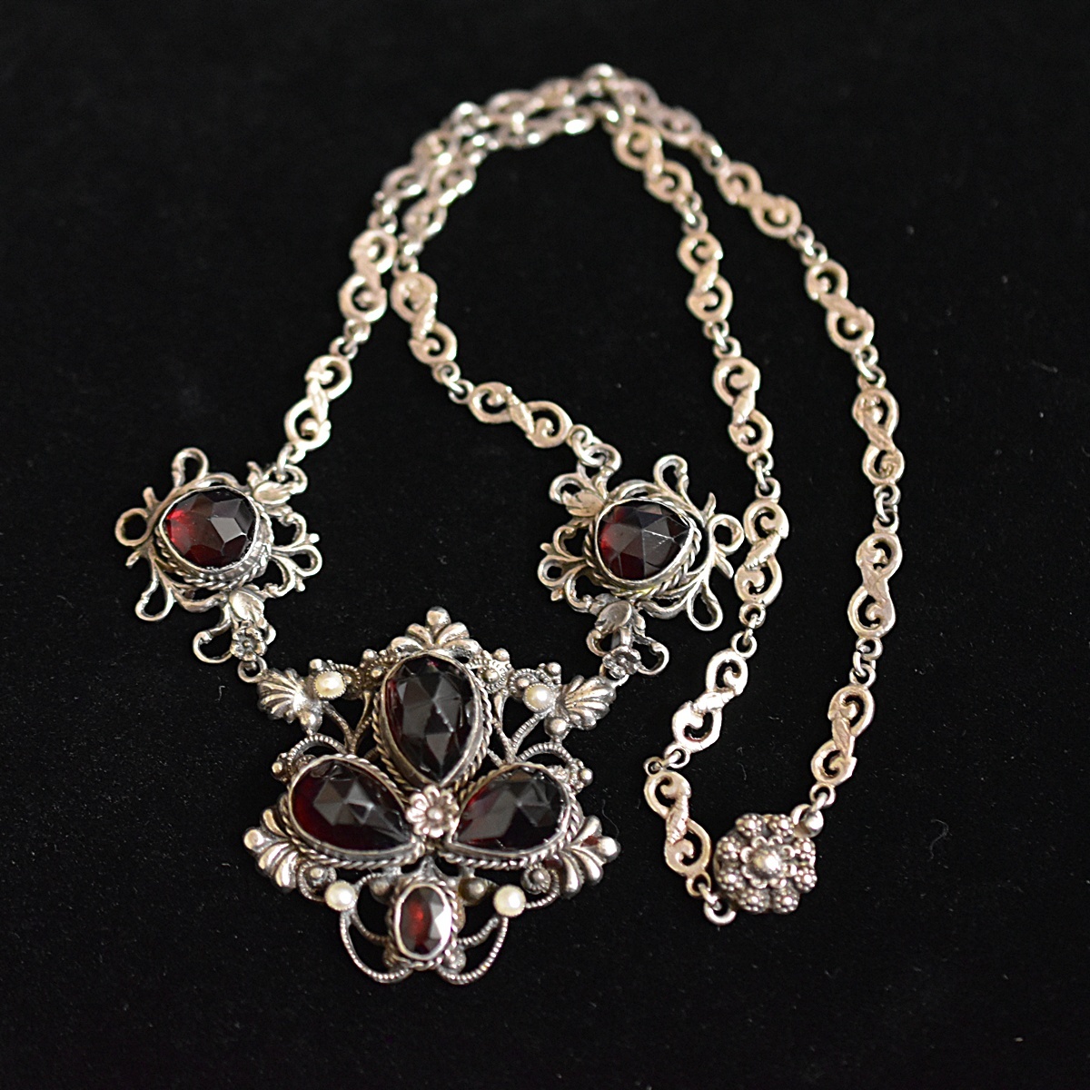 - オーストリア=ハンガリー帝国製 ローズカットガーネットと真珠/パールのクローバーの銀製アンティークネックレス ミル打ち ガーネット6石