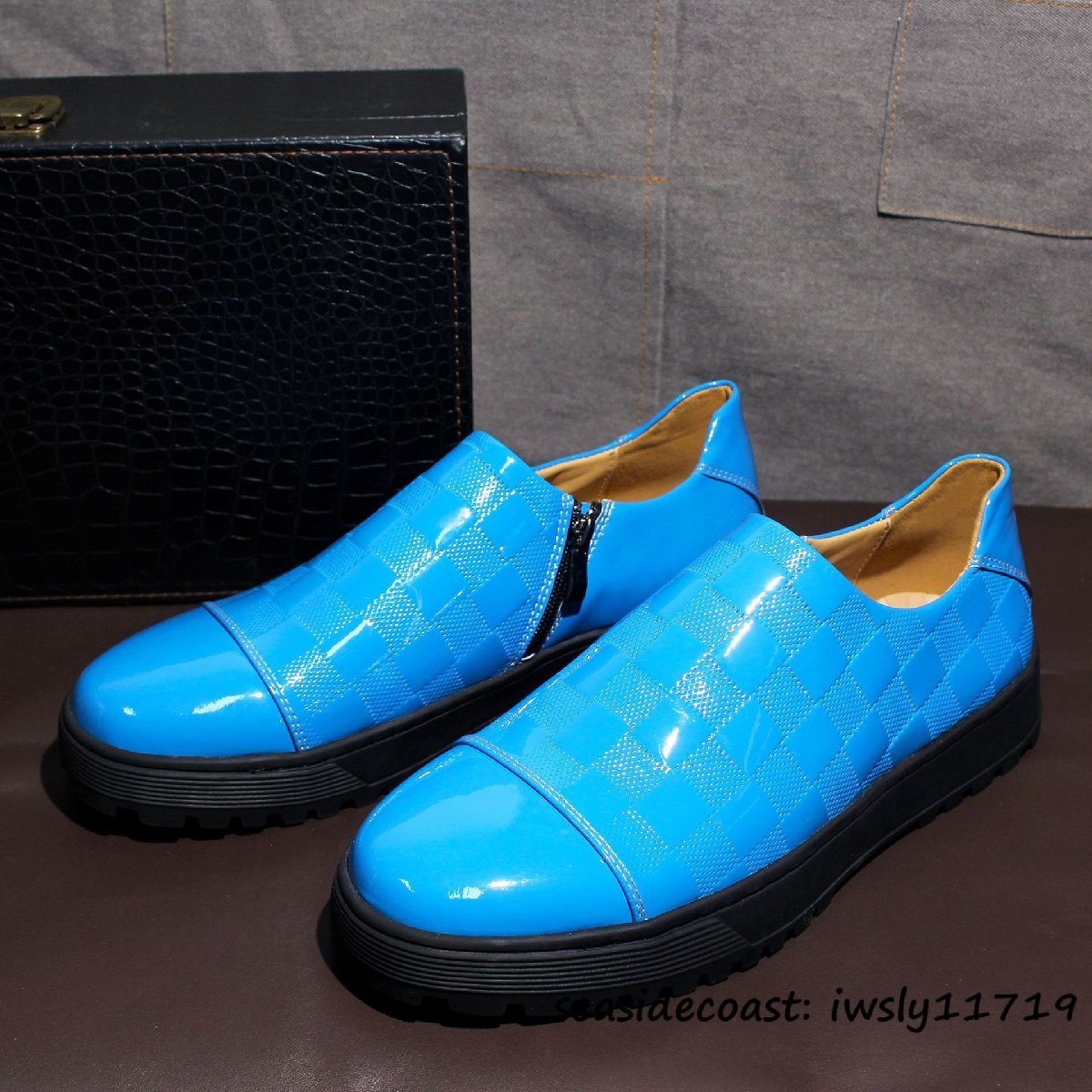 > 超美品■ローファー 本革 スリッポン メンズ 本牛革 ビジネスシューズ レザーシューズ 職人手作り ドライビングシューズ ブルー 26.5cm