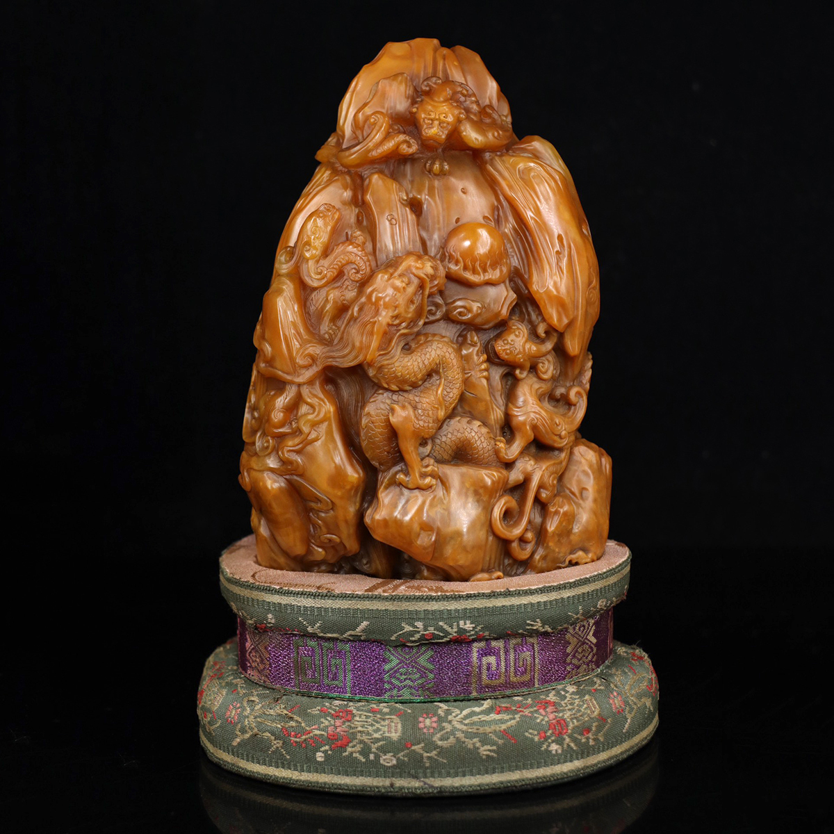 - ▽鴻▽清朝時代 寿山石 田黄石彫 博古魑虎印章 耐青作 箱付 時代物 中国古美術 骨董品